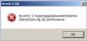tpM #23244 Biztos, hogy ez ACE függő? Én ilyet kapok sima Arma 2 indításnál valamiért (persze ott Arma2.cfg.3D_Performance a kiírás). Fogalmam sincs mitől van. :( -