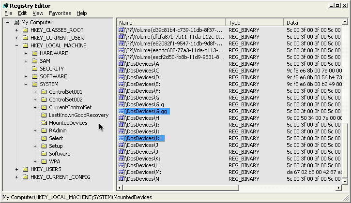 itt kell szerkesztgetni: HKEY_LOCAL_MACHINE\SYSTEM\MountedDevices