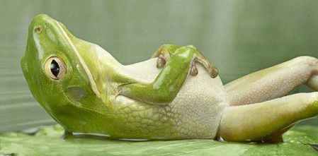 A múltkor találtam egy mappát, amiben vicces állatképek voltak. Ebben volt egy valóban levelibéka, ami egy levélen hanyattfekve fekszik, a két mellső lába meg a hasán.