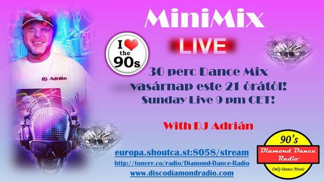 A minimixek a Disco Diamond Radio dance csatornáján mennek és természetesen élőben, ezek rendszeressége még nem került betervezésre, de aki hallgatja a csatornát el tudja csípni 21 órától. A Club 90 pedig élőben minden pénteken 19 órától, mind a 80as, mind a 90es csatornán megy egy időben. Ha bármiben tudok még esetleg segíteni keress bizalommal.