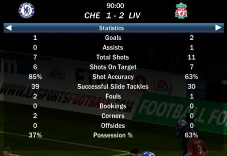 Benayoun (4.), Agger (32.) és Anelka (90.) lőtt gólt. Helyzetecskék voltak a Chelsea-nél, de komolyabb veszélyt nem jelenetett egyik sem. A végén Lampard labdájával ugrott ki Anelka, majd Reina mellett a bal alsóba lőtte a szépítő gólt.