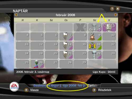 Mert történt, hogy elérkezett 2008. február, amikor már a naptárt nézve fogtam a fejem, mikor láttam, hogy úgy kezdődik a hónap a januári 29-ei keddi "vlmilyen van Trophy" összecsapás után, hogy egymás után két kupameccset kell játszani szombat és vasárnap (ráadásul, mint látható a képen, a vasárnapi Liga kupa döntő az Everton ellen). Elosztogattam úgy a játékosokat, hogy a szombati kupameccs után a legjobbjaim pihentek legyenek a vasárnapi döntőre. ÉS EKKOR JÖTT A MEGLEPI!!!