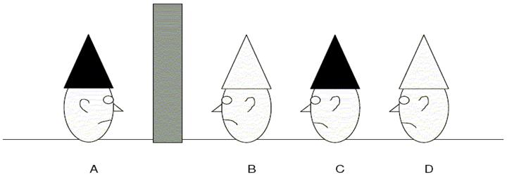 Abszolut nem tudnak mozogni, még a fejüket sem.Az „A“ és „B“ között egy betonfal van.Tudják hogy mindeki fején egy csákó van, ezekbõl 2 fehér 2 fekete. Ahhoz hogy a kivégzést elkerüljék egyiküknek meg kell mondani hogy milyen szinû a csákó a fején. Ha téved, akkor mindenki ki lesz végezve. Nincs 2. esély!!!
