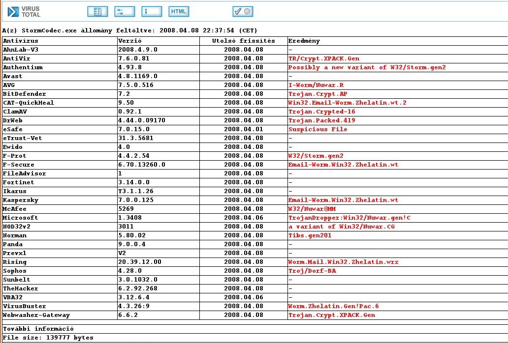 "Szerencsére az új NOD32 heurisztika jól teljesít, gépünkön az új, magyar nyelvű ESET Smart Security változat fut, és hiába látjuk azt, hogy a VirusTotal-on nincs találat - mert ott még egyelőre a 2.7-es verzió dolgozik - élesben, a számítógépünkön az újabb Storm változatoknak esélye sincsen." -