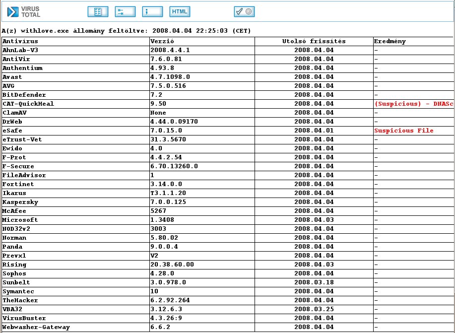 specialista #3308 Elméletileg igy van.Nálam a gyakorlat most mást mutatott.Amit Rambo letöltött withlove.exe-t és a VirusTotal-on megvizsgált Link,nála a Smart Security heurisztikája Valószinüleg módosult Win32/Statik alkalmazásként blokkolta.Amit én töltöttem le withlove.exe-t és megnéztem a VirusTotal-on,Link,azt nálam a Nod 3 bengedte és fel is tudtam telepiteni a gépre.A következő stormcodec.exe Rambo VirusTotal analizise: Lunk nála a Smart Security,nálam a Nod 3 Win32/Nuwar.CG féreg néven blokkolta.De ezt már az adatbázisból ismerte fel mindkét virusirtó.Egyébként az utolsó két VirusTotal analizis majdnem megegyezik,csak a kártevő nevében van eltérés.Érdemes a Kaspersky találatait összehasonlitani.Email-Worm.Win32 Zhelatin ww(amit nálam nem ismert fel a Nod)és Email-worm.Win32 Zhelatin wt.Az utolsó két betű jelzi,hogy ez már egy módosult változat. -