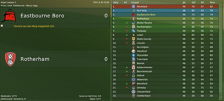 Viszont ezek az apró csapaton belüli gondok annyira ráment a csapat teljesítményére, h lassan eltávolodtunk a 3. helytől, aztán a 4., 5., 6. helytől... Kezdtem aggódni, mert április eleje volt, de még mindig gödörben volt a csapat. Az öltözői hangulat elérte a 18% -ot! Nem tudtam mit tenni. Tanácstalan voltam. Nem akartam így lemaradni idén is a feljutásról. A sok potya gól, a sok 90+ gólok, amiket bekaptunk (persze fölénnyel játszottuk a meccsket) megviselték a csapatot. Ennek hatására taktikát váltottam. A régen bevált taktikát hoztam újból elő, némi átalakítással és a jelenlegi keretre formálással. 1 kölcsönjátékos kivételével mindenkit visszaküldtem a csapatához, elégedetlenkedőket elküldtem végkielégítéssel (az öreg tartalékok is potyogtak), és teljesen levéve a csapatról a terhet, küldtem őket a meccsre.