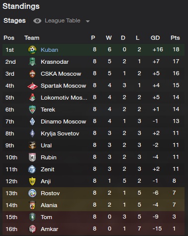 Zenszkij #92873 Na elértem az orosz féltávhoz, ami azt jelenti, hogy 20 meccs a 30-ból már lement decemberre. Következő forduló márciusban lesz. Így állunk. Krasnodar városa átvette a futballhatalmat Moszkvától. Ennyire azért nem vagyunk jók. Kikaptam egy Uraltól idegenbe 3-1-re. 3szor lőttek kapura, mi 10szer. Ki merem jelenteni, hogy cél a bajnoki cím. Ha megvan egy év után lépek is innen. -