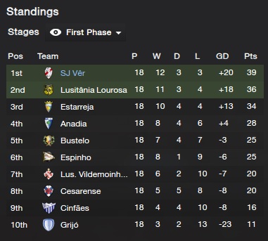 Jelenleg a portugál 3. vonal D csoportjában vitézkednek. Cél a playoff kör elérése volt. A playoff úgy jön össze, hogy van 8 darab 10 csapatos liga, azokból az első kettő bejut a 2 darab playoff táblára, mely januárban kezdődik. Itt összesen már csak 8-8 csapat van, nullázódnak a pontok és 14 meccs után az első kettő-kettő nyer promóciót a második vonalba. De lehet lesz még a promócióban valami variálás, mert a liga szabályait nem biztos, hogy jól értelmezem a konkrét feljutásra vonatkozóan.