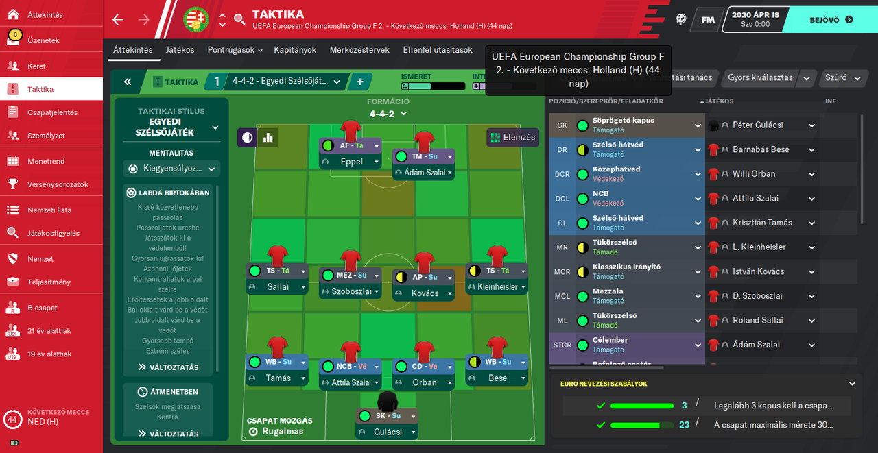 ozbom #104652 A magyar válogatott sikerén felbuzdulva kezdtem egy karriert velük az fm2020-ban. Sima 4-4-2-es felállásban.