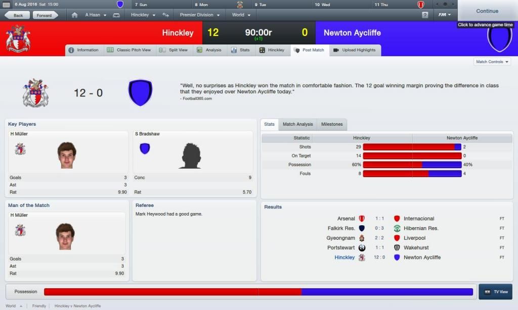 methyliso #86077 Sajnos nem volt elég, Hinckley csapatom kikapott 4-1-re. Nem tudtam jobb felkészülést kitalálni, megnéztem; a MU is egy gyenge észak-ír kis csapat ellen játszotta a legutolsó meccsét. Építik az új pályámat, így Hinckley egy másik pályáján kell játszanom ahol csak 320 ülőhely van. Az MU ellen így 320 néző lehetett max, gondolom az MU szurkolók örültek :)