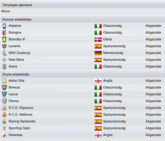 Eddig egy korábbi mentésnél a Sheffield küldte vissza Gárdost (a játékban el van b.szva, mert csak kölcsön volt ott), meg vmelyik ukrán küldött egy balhátvéd srácot, bár ő ha 5 meccset játszott nálam akkor sokat mondtam. Valahogy jó lenne egy Milant kifogni :D -