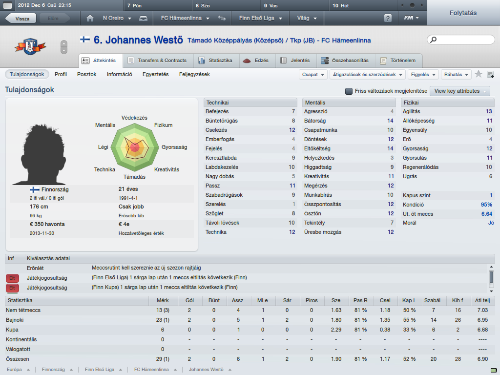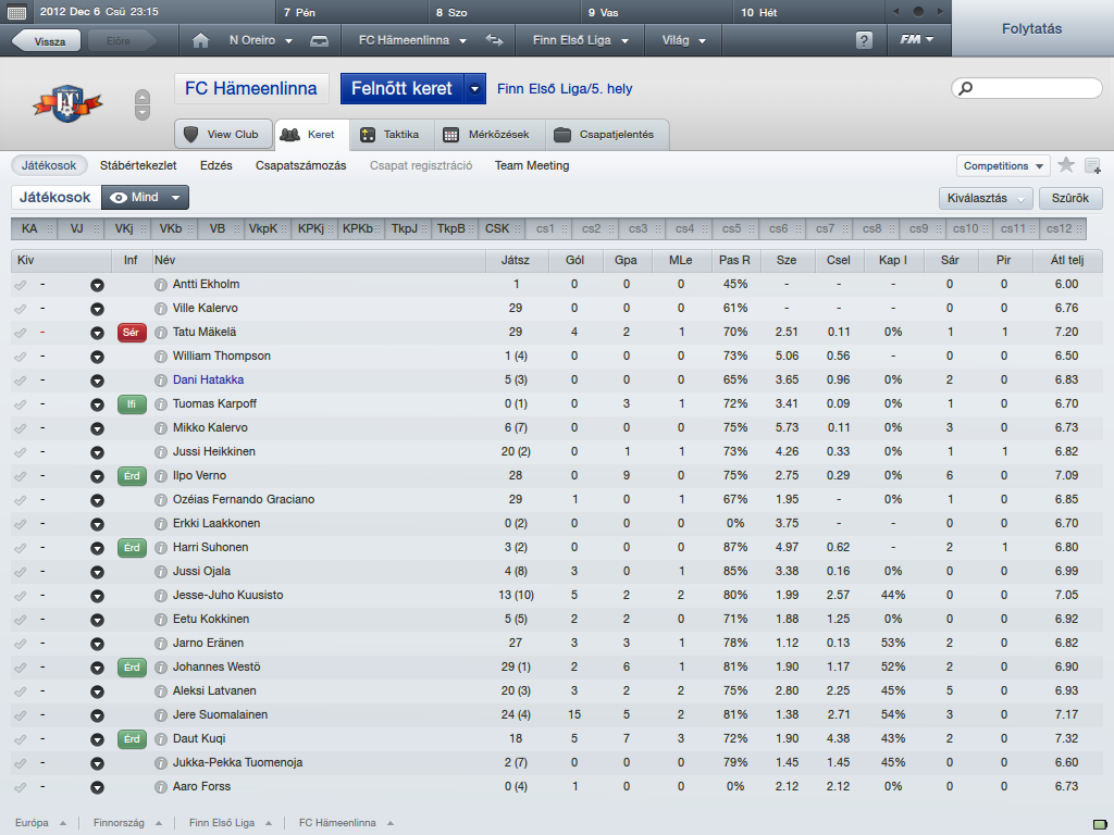 Íme a statisztika. Pár játékos hiányzik a képről, idő közben -szerződésük lejártával- távoztak. A próbajáték után szerződtetett Westö egész szépen teljesített, mellette Kuqi és a gólérzékeny Suomalainen teljesített átlag fölött. Nekik meg is hosszabbítottuk a szerződésüket.