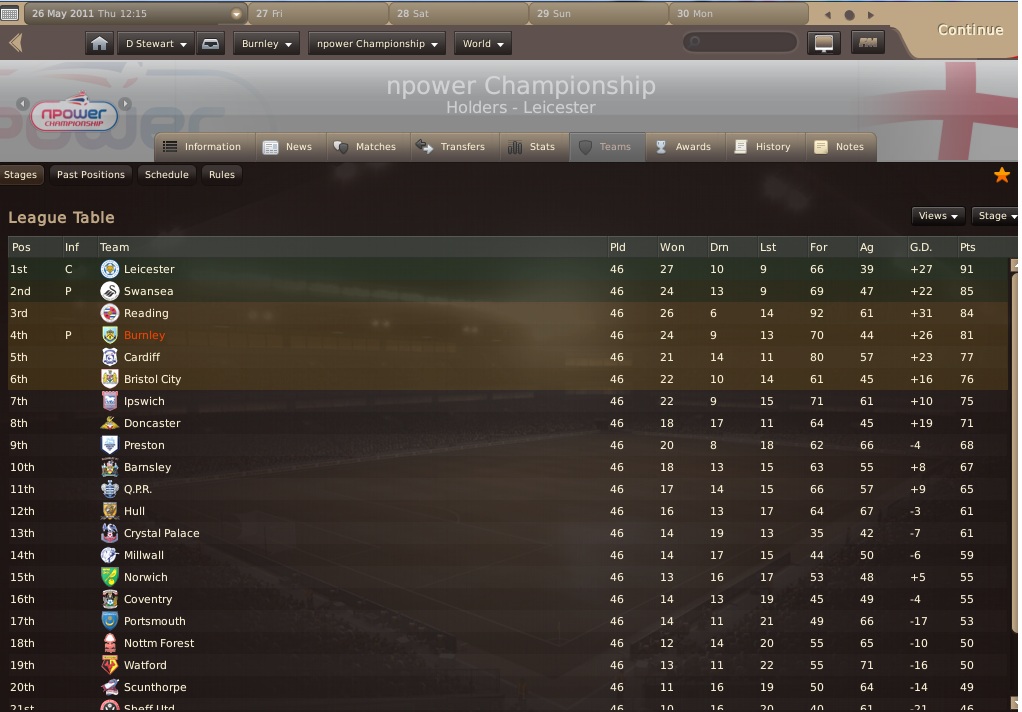 A bajnokság idén is szoros volt, és 3. PL-es évünkben behúztuk a bajnoki címet. Az utolsó fordulóban tartalékos csapattal kikaptunk a Burnleytől, de nem számított. Egyébként ez még azt is jelentette, hogy a Burnley maradt az élvonalban, az Everton viszont kiesett.