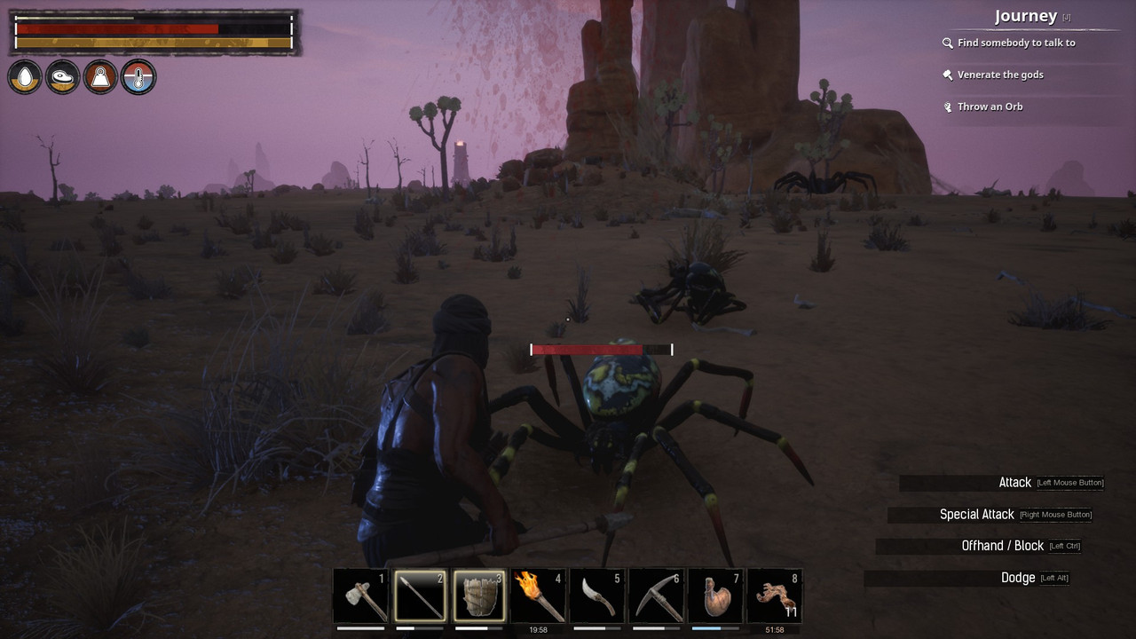 Nekem a Skyrim-es pókok pl. kifejezetten kedvesnek tűntek, bár én a Banyapókon szocializálódtam, amire valahogy ráragadt a hobbitok kedvessége (az emlékeimben :) ). Na de most a Conan Exiles-ben kifejezetten hatékonyan keltik fel a feszültséget. Eleve nem nagyon fogja az ember kezét a játék, és hát a noob river mellett amikor elkezd az ember portyázni a hegyekbe, és meglátja a bazi nagy hálókat, már beindul a képzelet. Vasat keresve nemrég feljutottam a fennsíkra, és hát igen, onnan jönnek... mindez étlen-szomjan, naplementekor (nyilván pók van a spoiler mögött)