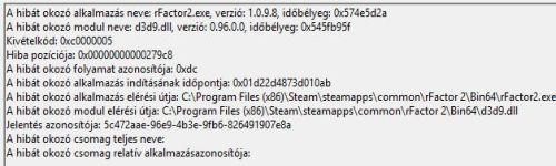 Sziasztok! Nem tudtok olyan gurut ajánlani aki a problémámra találna megoldást? Nem mindig kb 2-3 online versenyenként általában futam közben kilép a játék( rfactor2.exe hibát talált és leállt üzenettel) Windows 10-em van g27-el gtx660 vga i5 3570k proci. Berakom ide az eseménynaplóban talált hibát, ami mindíg ugyanaz: D3D9.dll hiba ami állítólag directx-re utal, ami a legfrissebb és az rf2 steam-es már! Teljesen kikészít, és ami pláne, annó ac is ezzel lépet ki random.
