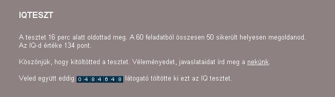 Most mér, nekem elsőre 13 perc volt, 41 jó válasszal és 116os IQ-val ugyanúgy, mint másodszorra 7 perc alatt XD -