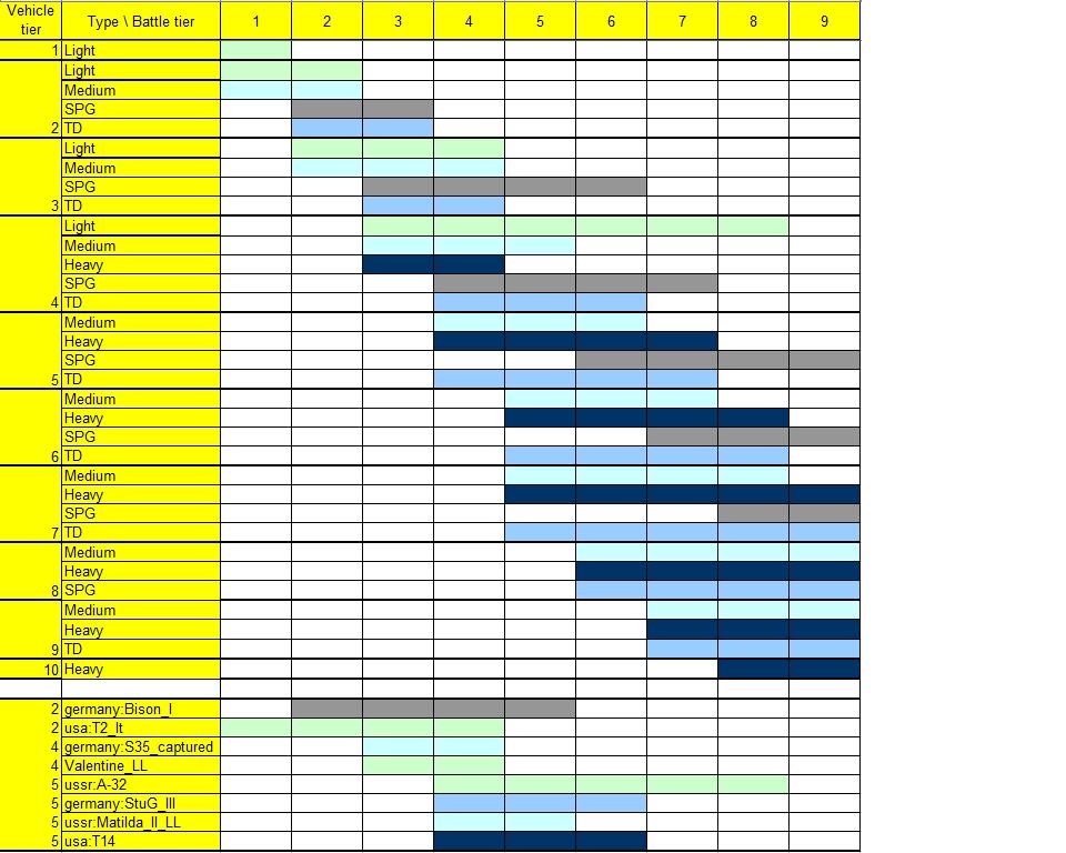 A táblázatot úgy kell nézni, hogy az adott csata szintjébe (függőleges oszlopok) meg lehet nézni, hogy milyen jármű kerülhet be (a járművek osztályozása a vízszintes sorokban olvasható). Egy Tier 3.-as könnyű harckocsi, mint a Lucus, 2-4 szintű csatákba kerülhet. Itt legfeljebb Tier 5-ös nehéz vagy közepes harckocsi illetve TD kerülhet veled szembe.