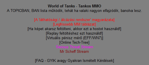 A 'láthatósági / álcázási rendszer' magyarázataLegfrissebb MM táblázat Képfeltöltés ittReplay feltöltés ittOnline Tech-Tree Virtuális pénisz mérő (EFF/WN7)Serious Threat StreamMr Scheff Stream[FAQ - GYIK avagy Gyakran Ismételt Kérdések]Individuális missziók listája TeamSpeak: pointer4.no-ip.org, jelszó nincs