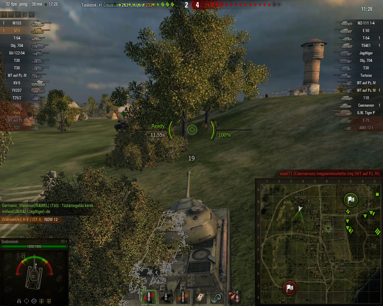 Semmi extra.El Hallufon beállok a bokorba fent a víz felől,két spotterünk lemegy,spottolnak is szépen.Egyet lövök,a második lövés előtt közvetlenük lök rajtam egyet ez a barom E75 aztán szépen mögém áll kereszben.Persze felspottolják,én meg egyből kapok vagy 3 lövést.Szerencsére annyi HP-m maradt hogy még szét tudtam lőni a hülye fejét.Szerintem fogalma sem volt róla hogy miért kapja mert nem fordult rám,nem is reklamált.