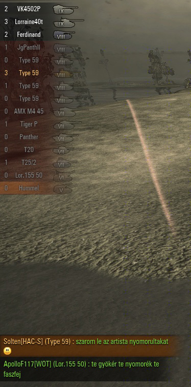 Hogy en mindig belefutok Tajgetosz pozitiv elolenyekbe... :/ Szerinte noob voltam mert nem detrackeltam egy KV-5-ot, hogy szepen kilohesse az allo celpontot (lol), helyette a KV-5 kepebe masztam (gondolom kozben el is talalt az artista agyhalott), mert ha a kepebe maszok pattoghat kupolan, nekem meg kenyelmes magassagban van az r2d2. Aztan szidott tovabb, kicsit meg jobban cukkoltam... :)