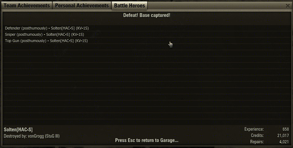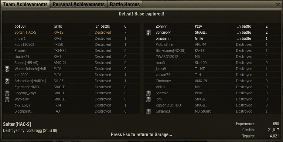 bgabor #155388 Hát igen, az egy nagyon emlékezetes meccs volt, emlékszem a replayre, szépen megmutatta, mekkora különbséget okozhat a camo és annak hiánya két tökugyanolyan tanknál. Szakesz a malinovkás varázsbokorból csinált több killt úgy hogy végig sértetlen maradt, nagy volt. -