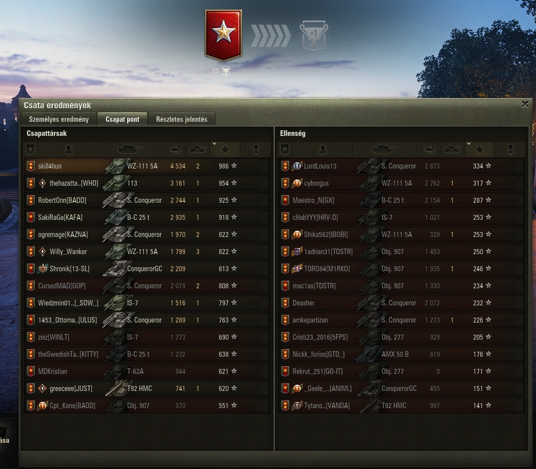 Kurtos_Kalacs #403722 Na igen elírtam, remek. Nos kb. 7000 csatám van több akkon és azért van az a bizonyos "több akk" mert sok tank érdekelt és nem tudtam eldönteni melyik a legjobb számomra. A jelenlegi akkomon 3500 csatám van és ennél szeretnék is megállapodni. Tankok szempontjából az M46 Patton-nál, a T-43-nál, a KV-1S-nél, MT-25-nél és a T 25 AT-nál tartok illetve van funra KV-2, BT-7 + egy pár más ingyenes prémium tankom: T-34-85m, T-34s, T95E2, T-29. Egyébként az újat lenginkább ide a fórumra értem de a játékban is van rengeteg dolog amit még meg kell tanulnom. Quickybaby-t nézem és kedvelem is a videóit. -