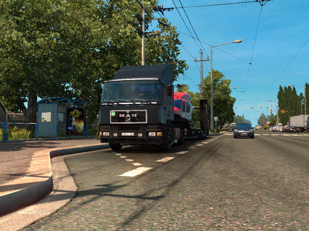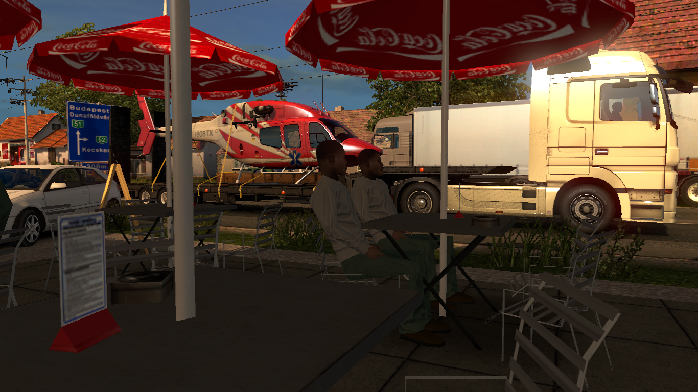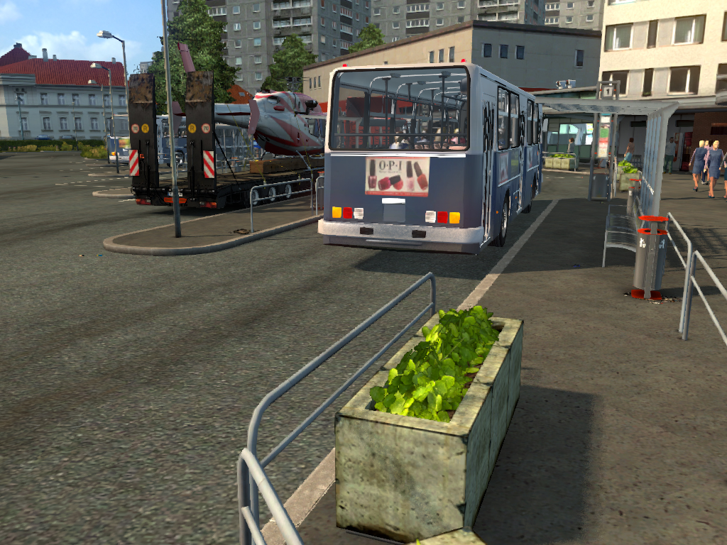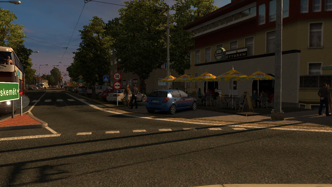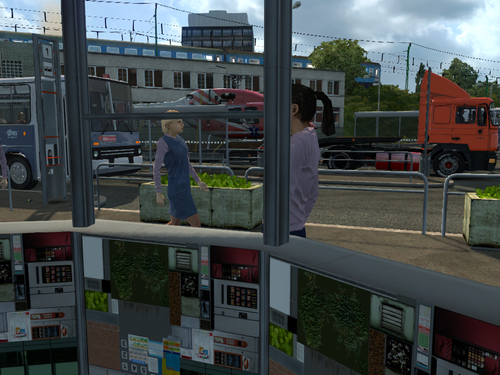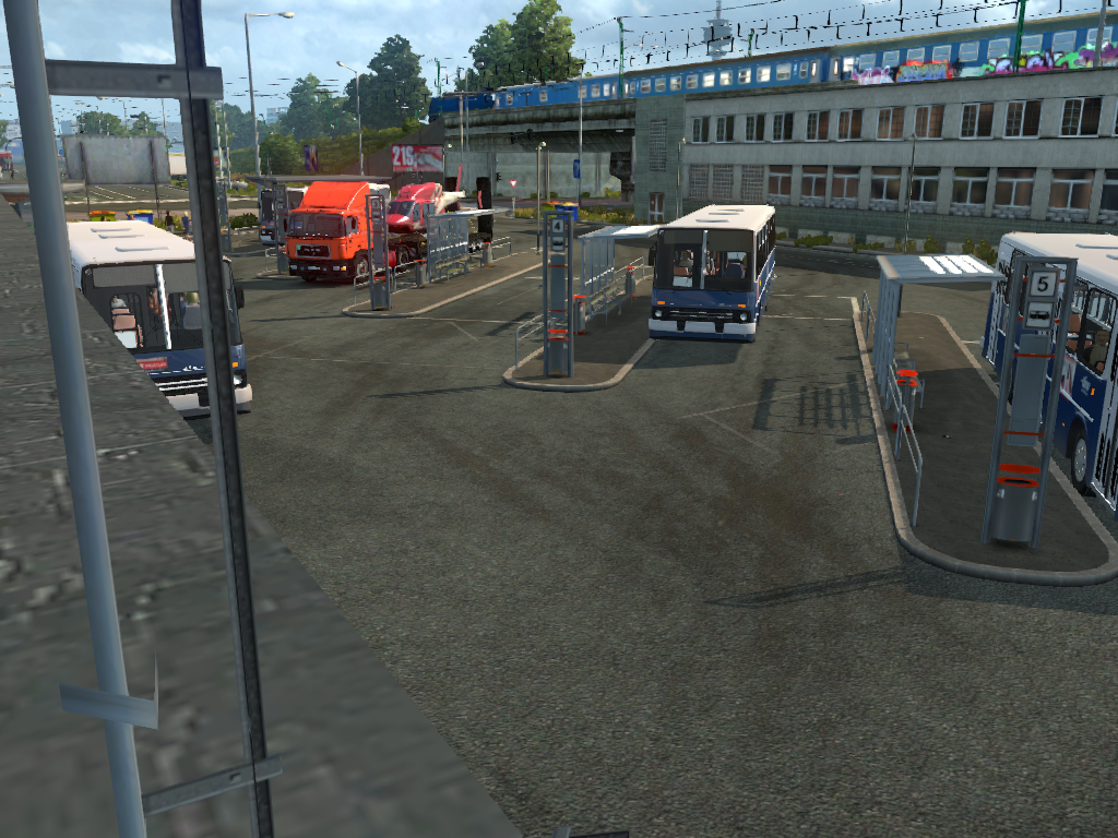 Első pihenő egy hangulatos buszállomáson. (Sajnos a BKV buszok is csak helyben állnak, érthető is ne mászkáljanak Kecskeméten. Pedig látnám értelmét az SCS helyében leprogramozni a játékba hogy egyes AI autók, kamionok egyes területekre(pl ország) legyenek lekorlátozva, vagy akár egyes cégek pótjai/kamionjai.)