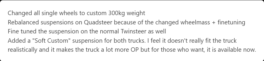 Nem tudtam ellenállni a kísértésnek és nekimentem. Vagy ötödszörre indítom újra a játékot, hogy ellenőrizzem az eredményt, de semmi. Illetve van valami, de messze nem a várt eredmény. Bogarászom megint a fájlt és egyszer csak beugrott. Minden járműnél a felfüggesztés erőssége egy 0.03 körüli érték Ha egy századot emelsz, vagy csökkentesz, akkor már jelentősen befolyásoltad a rugózás erősségét. A modder is ott cseszte el, hogy felemelte 0.08-ra. Ami már nagyon sok!!!!