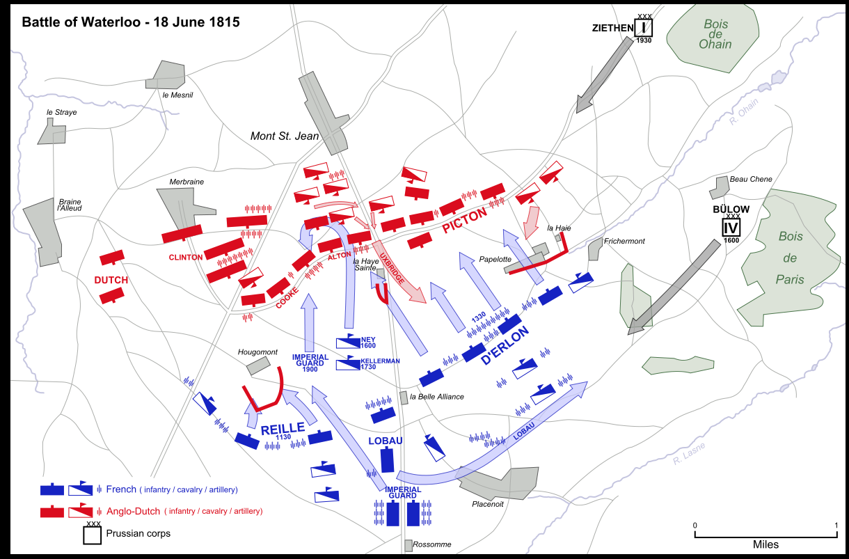 az angolok már visszavonultak engedve a francia nyomásnak, és egy kis emelkedő mögött probálták rendezni soraikat, de már csak két soros vonalra futotta, ha a franciák nem vonulnak vissza megijedve a poroszok megérkezésétől (akik alig voltak harcképesek emlitett dolog és a erőltetett menet miatt) akkor áttudnak törni, kb a térképen látszik is, de a lényege hogy az angolok elkezdtek már visszavonulni...