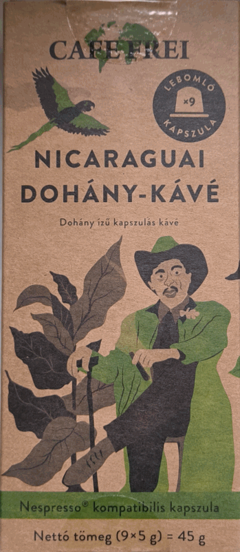 "A Nicaraguai dohány-kávé zacskójában a Cafe Frei nemzetközi kávézólánc egyik legsikeresebb receptjének otthoni változatát találja. A dohány-kávé Nicaragua fűszeres, füstös, latin ízeit csempészi a lakásunkba. A közép-amerikai országban a dohányleveleket lédús alma-reszelékbe áztatják, amiből egynapos pihentetés után krémes eszenciát főznek. A kávészemeket ebbe a sűrű krémbe forgatják bele, hogy minden szem átvegye az egzotikus dohányízt és a különleges illatot."