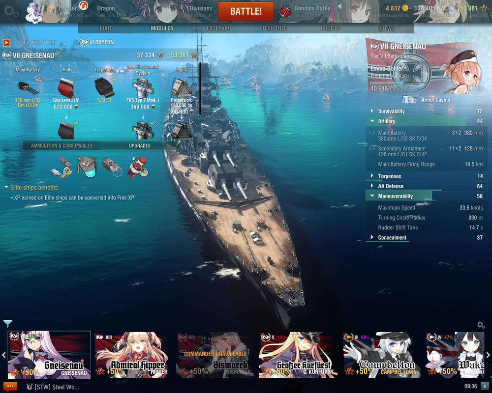 Szóval a Gneisenau-nak már nemigen van erőssége... Meg merem kockáztatni, hogy az egyik legszarabb BB Német vonalon. Utána már nyilván csak jobbak jönnek, de előtte is élvezhetőbb volt a Bayern, König, Kaiser. Túl kell rajta esni összeszorított fogakkal, aztán jöhet a Bismarck! De persze ahogy a kolléga is mondja: premium nélkül még tovább kell szenvedni.