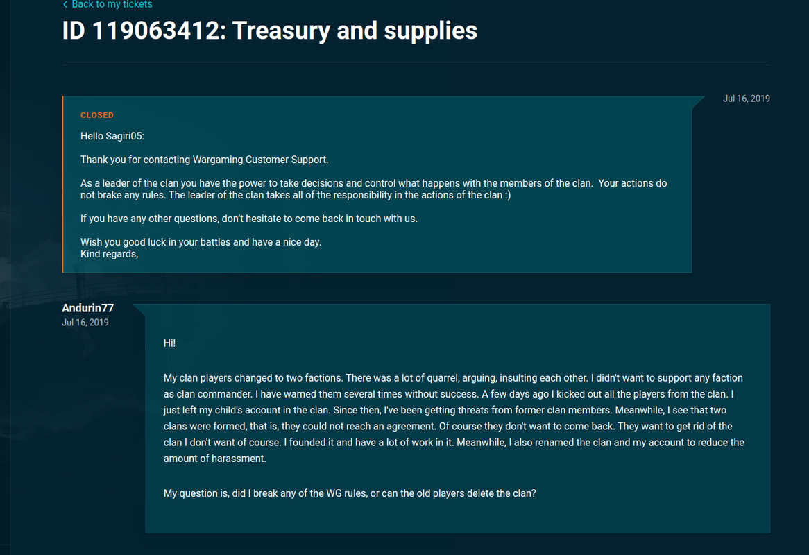 Nem véletlenül írtam a supportnak a témában azonnal. Kaptam is rá hamarosan választ. A WG szabályai egyértelműek. A klán annak a tulajdonát képezi, aki alapította. A vezetést átengedheti saját döntéséből, de erre semmilyen formában nem kötelezhető. A klánból bárkit, bármikor kitehet, ha úgy látja helyesnek. Ebben az esetben akár mindenkit is, ha egyik félnek sem akar kedvezni.