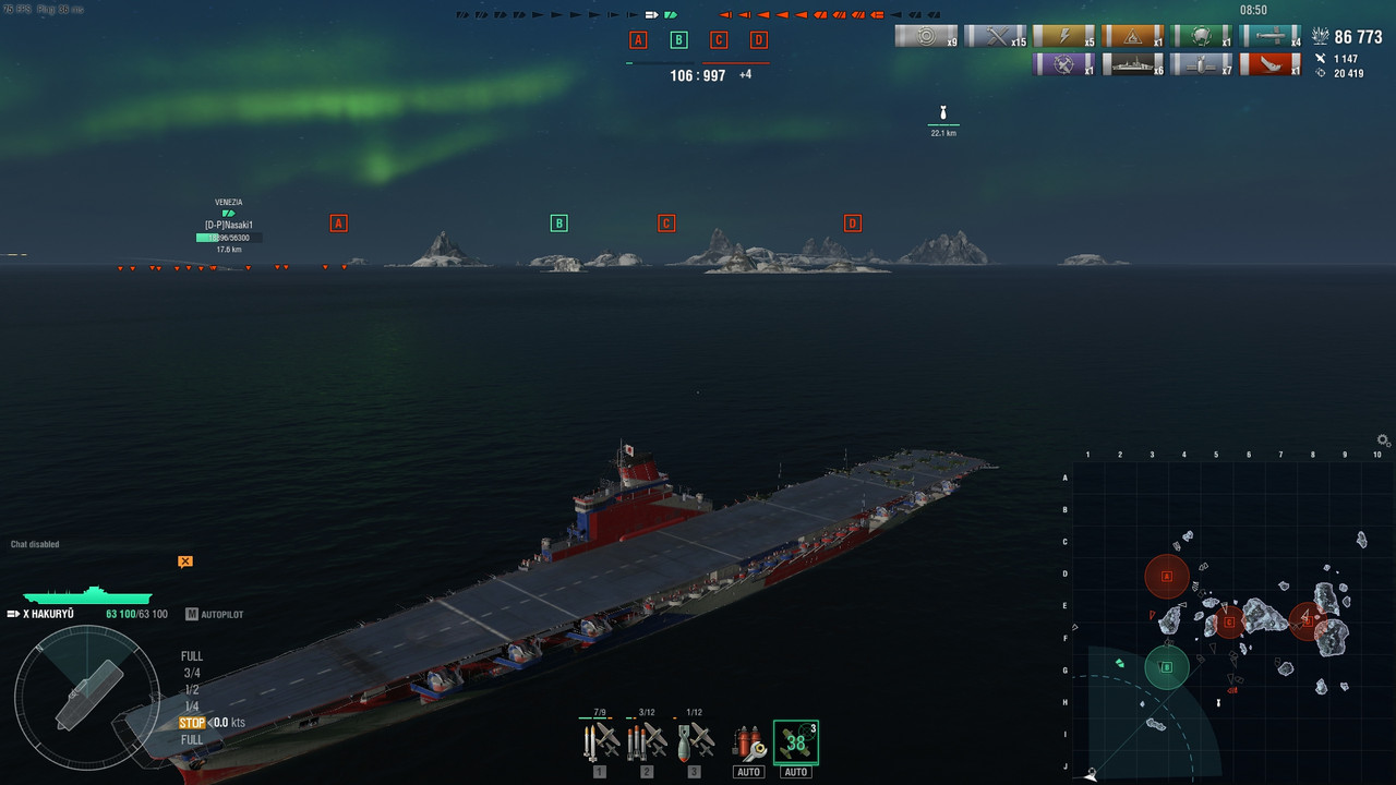Már az első csatában elszoktam osztogatni a chat reportot. Azt legalább megérzik idővel, ha mástól is azt kapnak. Mindezt úgy, hogy továbbra is kénytelen vagyok kikapcsolva tartani a chat üzeneteket, mert nagyon zavarónak és idegesítőnek érzem, hogy minden idióta csatahajós CV szakértőnek képzeli magát, miközben ha csata végén veszem a fáradtságot és ránézek egyik-másik iritáló játékos acc-ra, kiderül, hogy még T4 CV sincs a kikötőjében. A legnagyobb csatahajója meg egy Tirpitz, amivel sikeresen tartja a piros statját. Fejleszett hajókból meg van neki egy T6 csatahajó. És ne akarjam pofán vágni véletlenül.