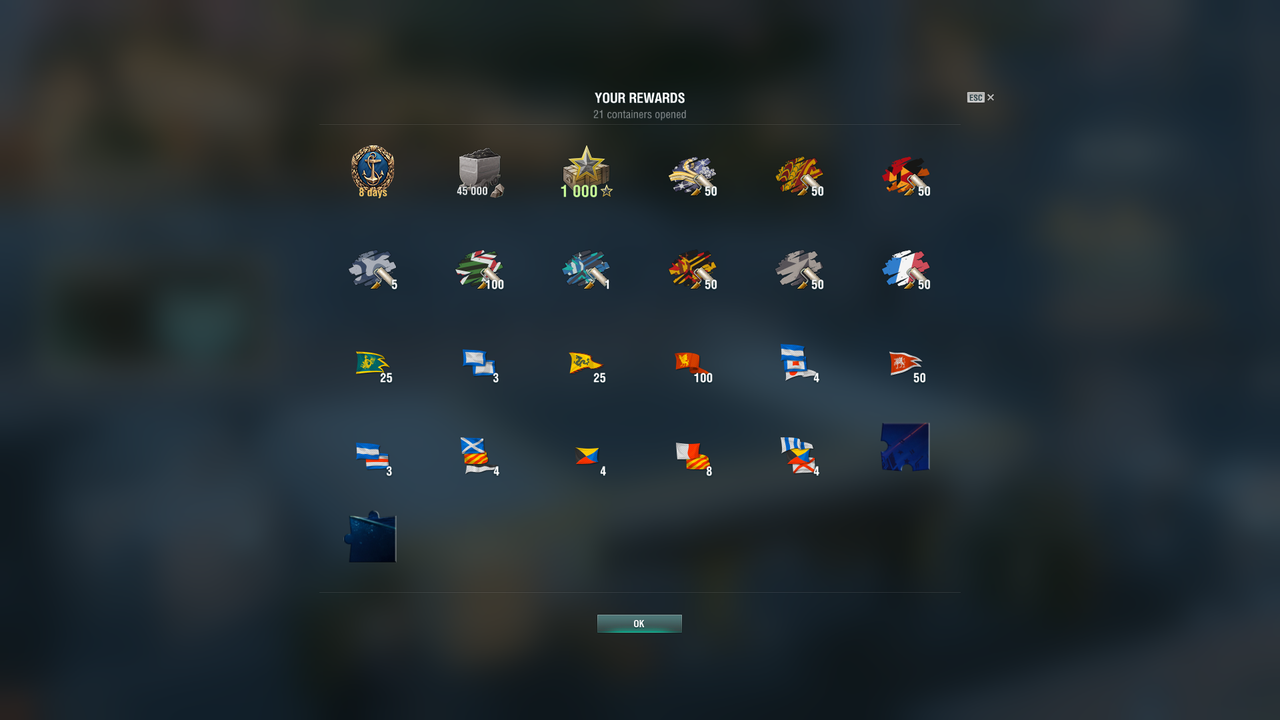 Más: Travelling konténert 3db-t szedjétek ki, azt javaslom. Nem túl drága. A háromból, kettőben volt T10 hajóra perma camo nálam. Az egyik a Daring, a másik meg a Hindenberg-é. Örültem nekik. A romboló még nincs meg, de jó lesz majd rá később.