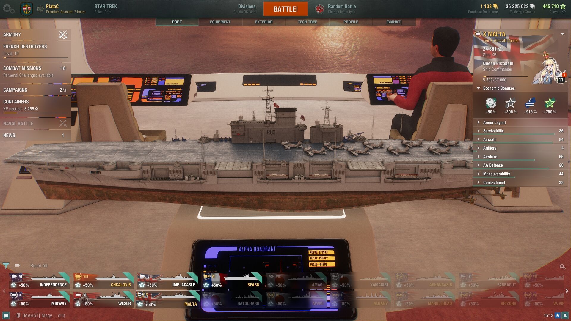 bekescsaba #22091 A Máltát szerintem torpedóra kell specializálni, így elengedhetetlen a torpedóvető repülő gépek HP boostja (nekem a raj majd 43 000 HP-val rendelkezik, összehasonlításképpen a japán szuper CV - Sekiryu - torpedós raja éphogy eléri a 24 000 Hp-t. Ez a gyakorlatban azt jelenti, hogy ha elkapsz egy magányos BB-t, akkor kb 10 torpedót tudsz rádobni.