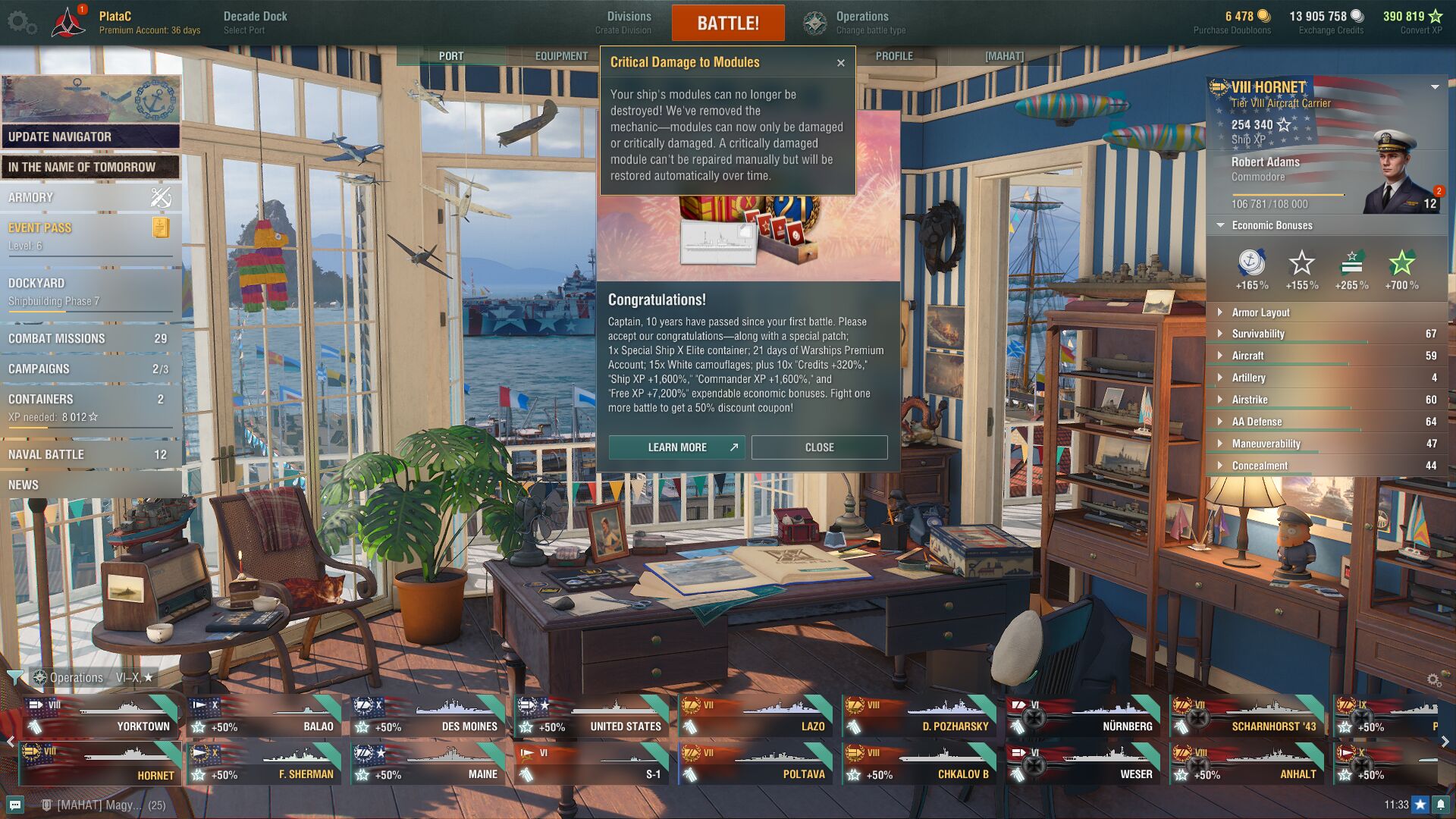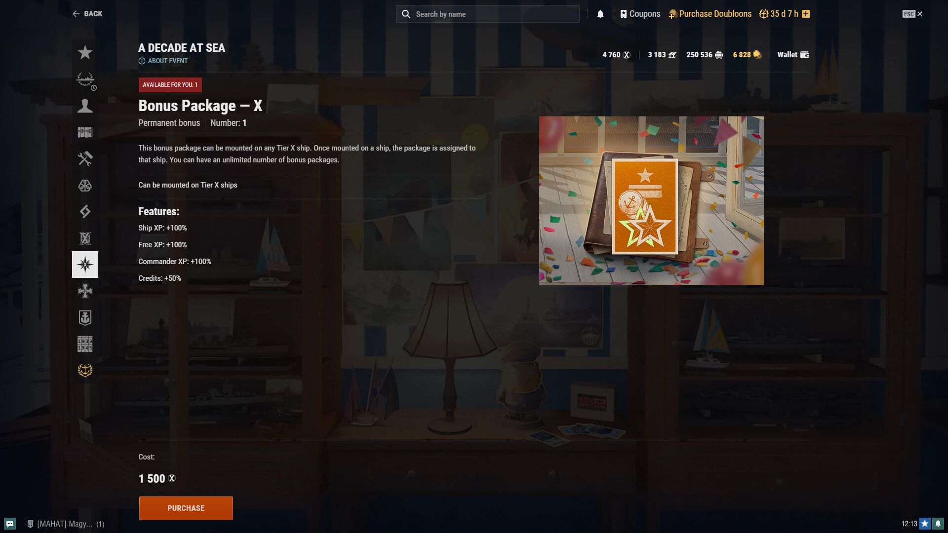 más: a decade at sea menüben az armoryban ki lehet venni 1500 tokenért egy t10es bonus packaget,amit bármelyik t10 hajóhoz hozzá lehet kötni