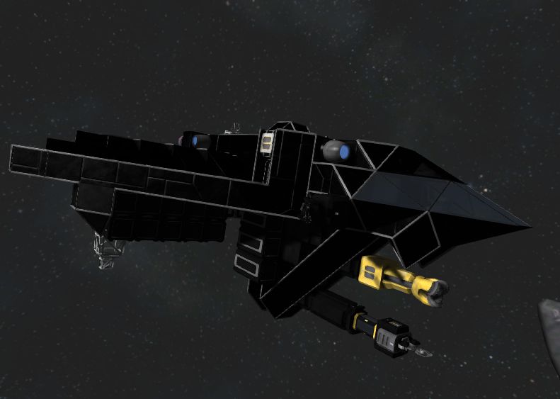 A fúrófej sajnos túl nagy ennek a hajónak, viszont feltétlenül kell nekem, talán majd egy modban lecserélhetem kisebbre. Egyszerűen nem tudtam neki egy normális depót építeni, túl nagy a helyigénye, ezért kicsit dizájnosítottam az oldalát, mintegy félig-meddig védő pajzsot csináltam oda, és ha már ott volt, akkor telepakoltam rakétákkal. A bontó is nagyon kell, mert olyan jó dolog lesz egy megbénított hajót kényelmesen pilótaszékből felnyitni. :)