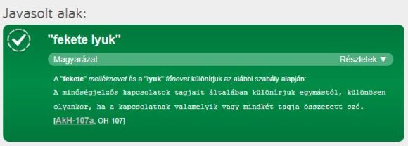 Vol Jin #6 Ha a fekete egy szimpla jelző lenne, akkor valóban külön kellene írni, mert a lyukra úgy vonatkozik, hogy közli annak fekete voltát. Csakhogy ebben az esetben egy új kifejezést hoz létre, mert a feketének és a lyuknak sem az lesz az értelme, amit önmagukban jelentenek. És ez akkor is így lesz, ha a professzorok az egyetemen kocka jellegükből adódóan nem ismerik a nyelvtant. Ez a kifejeztés úgy terjedt el helytelenül, hogy a csillagászok hülyék voltak a nyelvtanhoz, a nyelvészek meg hülyék voltak a csillagászathoz, hogy a helyszínen jelezzék, hogy emberek, azt nem úgy kell írni. -