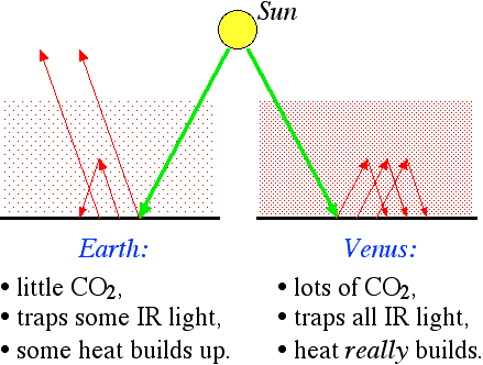 Nem kell hozzá Einstein-i ész, hogy megállapítsuk azt, hogy az a klasszikus üvegház szituáció, hogy magas frekvenciájú napsugárzás megvilágítja a felszínt, melegíti az energia egy részével, amelyet a felszín hosszúhullámúként visszasugároz, aminek egy részét viszont nem ereszti át közvetlenül a légkör, visszaveri, magasabb hőmérsékleten áll be a hőmérsékleti egyensúly, nos az itt a Vénusz esetében nem számottevő.