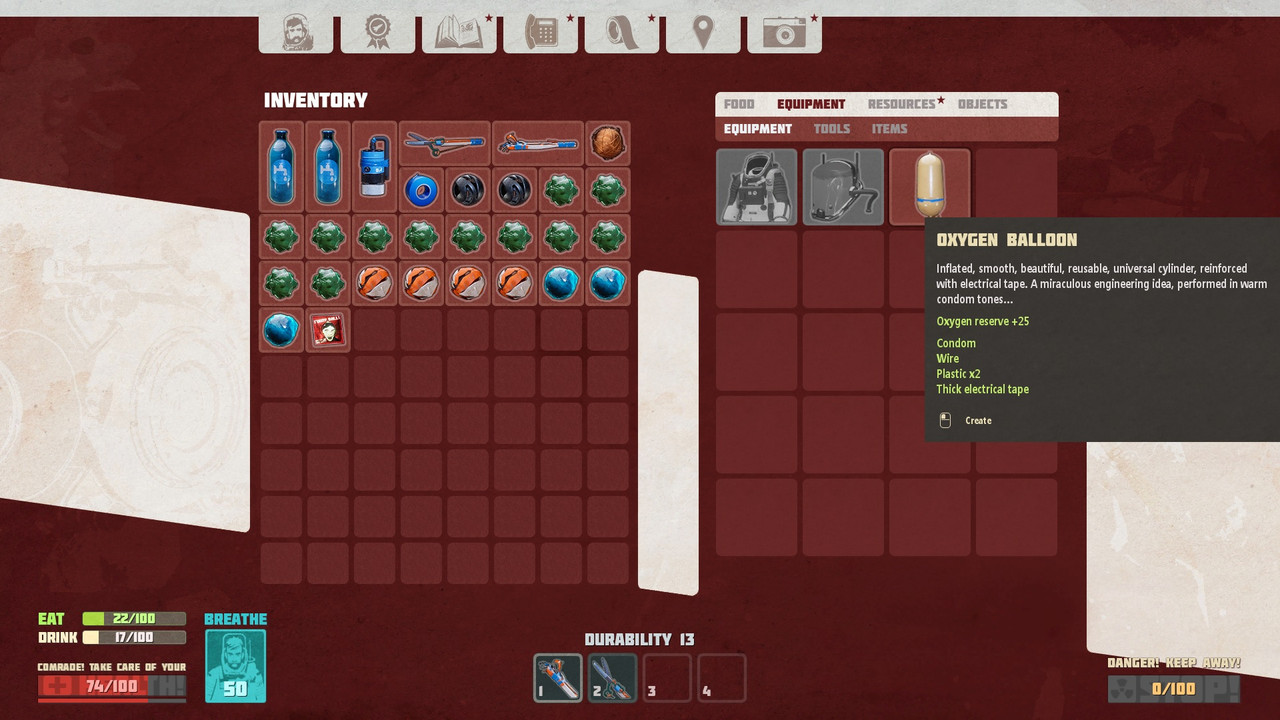 SPOILER! Kattints ide a szöveg elolvasásához!Tetszett amikor a festékekért el kellett menni,ki hitte volna hogy azon a piros részen lesz a paint,és a lead,pont egy helyen,de kellett oda féluton lerakni 2 oxigén generátort.kell mind az 5 ürruha felszerelés,bár a zseblámpa felesleges,én nem használtam egyszer sem,bár lehet avval kell túlélni a hideg részeket,fene tudja.Viszont az 1200 méterre lévő találkozási pont nagyon messze van,és így megvéd minket az összes ruha az ürbéli sugárzástól.Hajszál híján,mert mire odaértem,épp hogy majdnem betelt a sugárzás jelző csík.Odafele keresztül kell menni a hideg zónán,ott is majdnem megfagytam,de felül van egy pirosan kivilágitott konténer,az leveszi a fagyot rólunk,aztán irány tovább.3 oxigéngenerátor elég az odaúthoz,el kell helyezni őket szépen,az utolsó pillanatban,és nem árt egy oxigéngyertya is,engem az mentett meg a végső méterekben.Ha odaértünk ott már lesz oxigén,és egyértelmü is lesz mit kell csinálni,a végét nem lövöm le spoilerben sem.