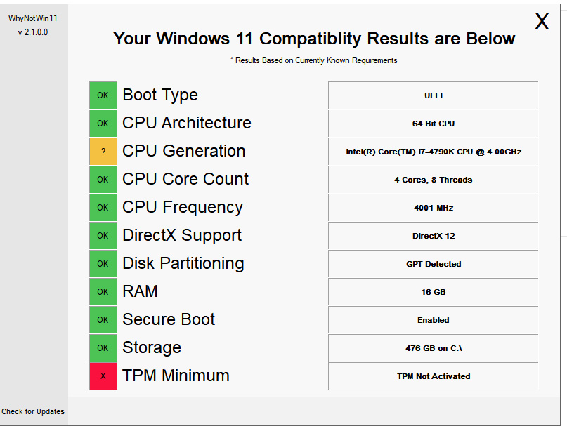 WhyNotWin11 - részletes info mi hiányzik a W11-re való frissítéséhez