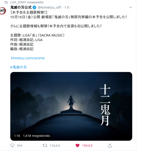 Plusz most került bejelentésre, hogy az októberben érkező Demon Slayer Infinity Train zenéjéhez is köze lesz, bár ez szerintem nem nagy meglepetés a tavalyi Demon Slayer S1 Opening/Ending téma után.