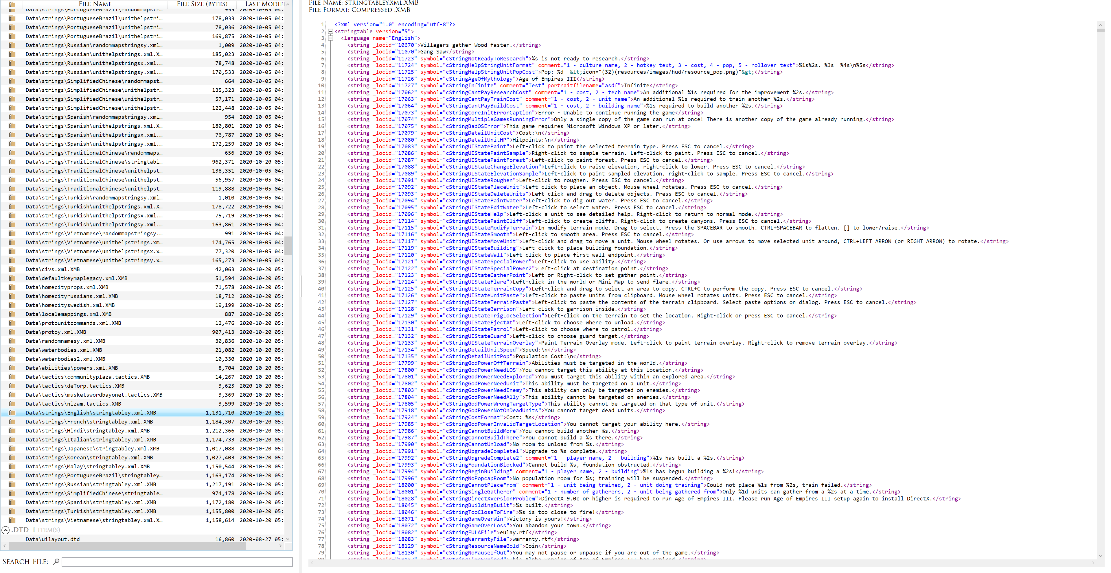 Régen, XML fájlokban voltak a szövegek. Most .BAR fájlokban vannak, ami egy kódolt és tömörített fájl. Anno is alkalmaztak ilyen fájlokat, bár akkor azokban csak hangokat és textúrákat tároltak, most a szövegek is ebben vannak. A klasszikus BAR extractor, amit a régi Age of Empires III-hoz készítettek nem működik az új verzióval, szóval egyelőre még nem találtam megoldást az új változat fordíthatóságára.