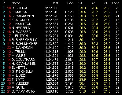 WNW #53528 Csak O full puha gumikkal ment, a tobbiek meg a kemennyel..:) Erdekessen jatszanak a jobb elso gumikkal.. Van amelyik kocsira fullra kopott szinte slick gumit pakolnak fel a jobb elso kerekre.. Va olyan, meg mintha arra kemeny menne, a tobbire meg a puha.... A Ferrarik meg a delutani edzesen vagy kemeny gumival mentek, vagy szarra koptatott puhan.. -