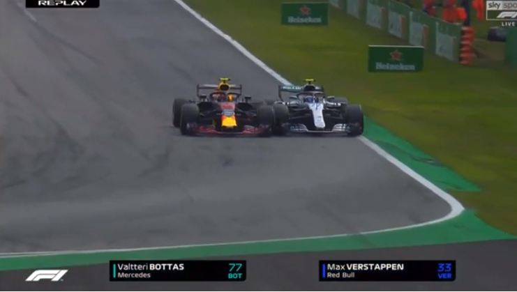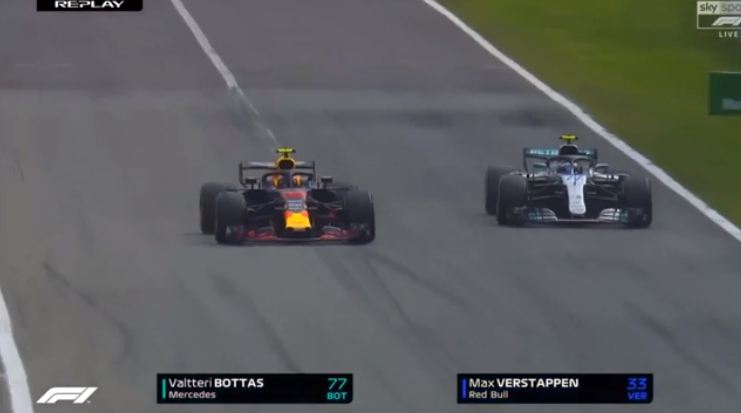 Ebben a videóban benne van egy másik kameraállásból is az eset, és tökéletesen látni (0:27-től), hogy Bottas még bőven Verstappen mögött volt, amikor utóbbi már a pálya széle felé tartott egyenes vonalban (az ideális íven), Bottas meg betette mellé az autóját, semmi irányváltás vagy extra mozdulat Bottas felé nem történt, egyszerűen Verstappen zárta az ívet, Bottas meg (és itt a hasonlóság a Spa-i esettel) Perezzel ellentétben lassítás helyett bátor volt. Versenybaleset, ennyi.