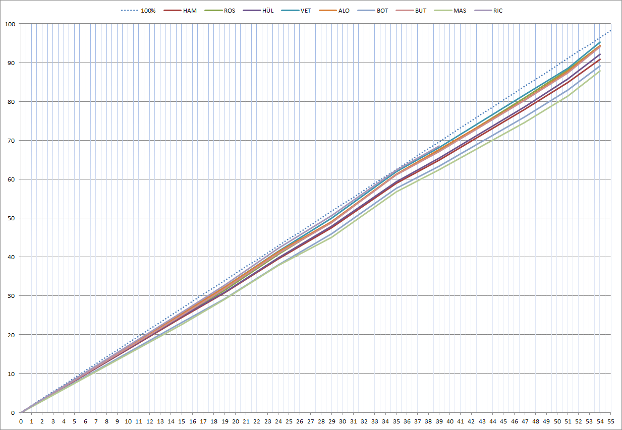 A két redbul érte el szinte egyedül a maximális benzinhasználatot, a 60. kör közelében, de végig elég sokat fogyasztottak.. .És látszik, hogy Hamiltonnak még jócskán volt tartaléka emellett a tempó mellett is ....Ha javul a Renault motor, elég csak picit feltekerni nekik :DDD -