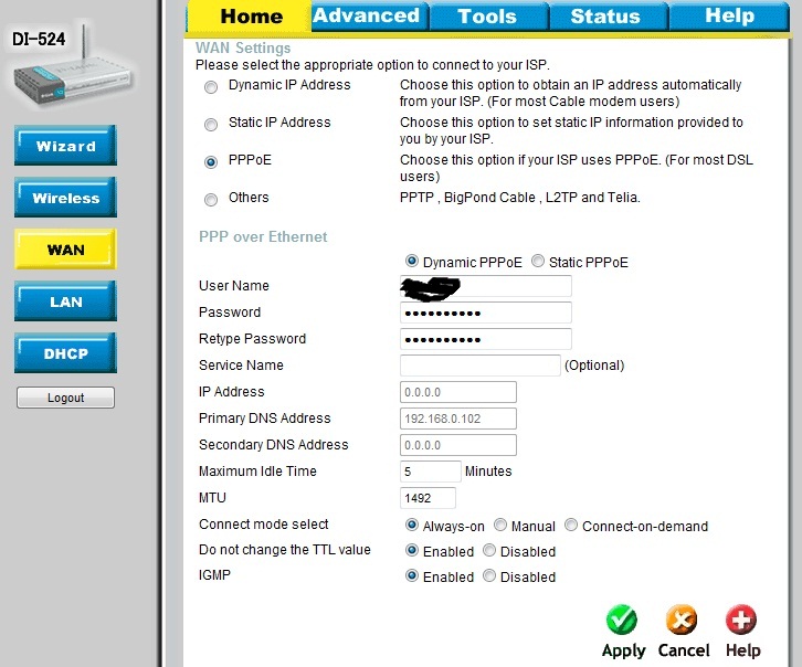 Mint előttem is leírták, ha ADSL-kapcsolatod van (adott felhasználónévvel/jelszóval kell betárcsáznod), akkor PPPOE-kapcsolatot kell beállítanod a routerben. A router fog betárcsázni a szolgáltatóhoz, kap IP-címet, alhálózati maszkot, a szolgáltató alapértelmezett átjáróját, és DNS-címét (ezeket az adatokat sikeres betárcsázás után D-Link DI-524-es router beállítófelületén a Status menüpont Device Info almenüpontjában a WAN résznél olvashatod).