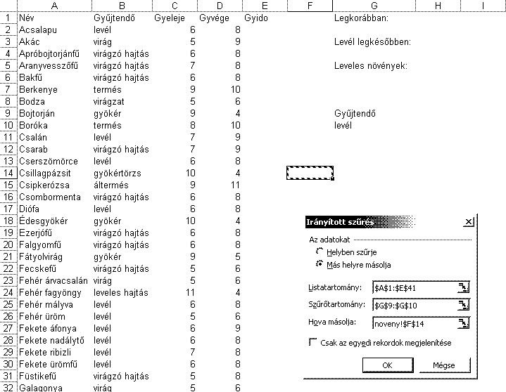 Van egy táblázat, és abból a géppel kikell íratnod azokat a növényeket, akiknél a leveleket gyöjtik (levél van a táblázatban)! Én AB.Mező vel próbáltam, de utána rájöttem, hogy az csak 1-nél működik!! -