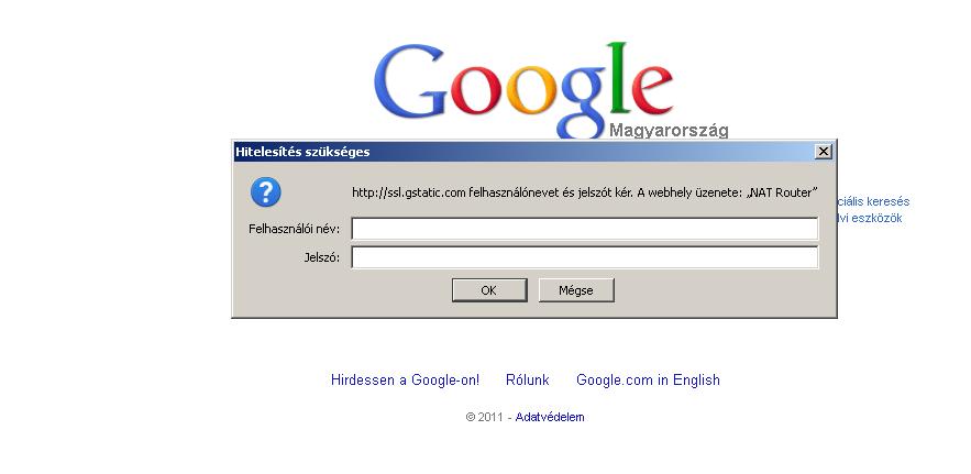 http://ssl.gstatic.com felhasználónevet és jelszót kér. A webhely üzenete: „NAT Router”