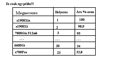KILROY #301 Nem akarom fikázni Borgot, vagyki... de sokkal több emberen segítene, ha a Videokártyák erősorrendje c. táblázatba be lenne írva az adott VGA-kártya ára. Szerintem ez az egyik legfontosabb szempont. -